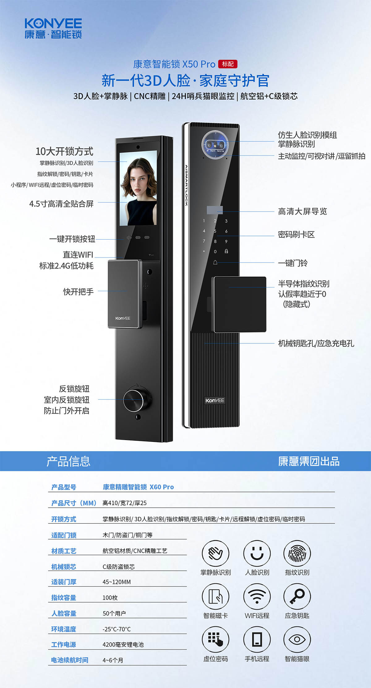 康意 X50 Pro 精雕款全自动人脸识别智能锁
